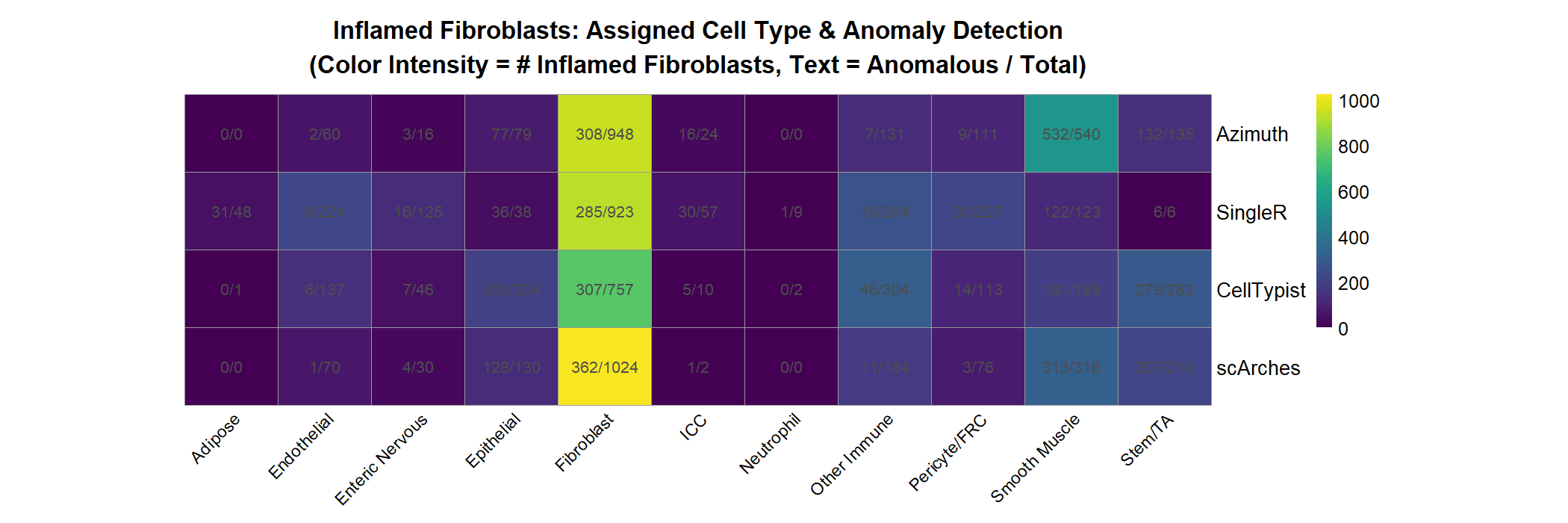 scDiagnosticsanomaly detection on each method’s predictions - Creates heatmap showing IAF distribution across predicted cell types