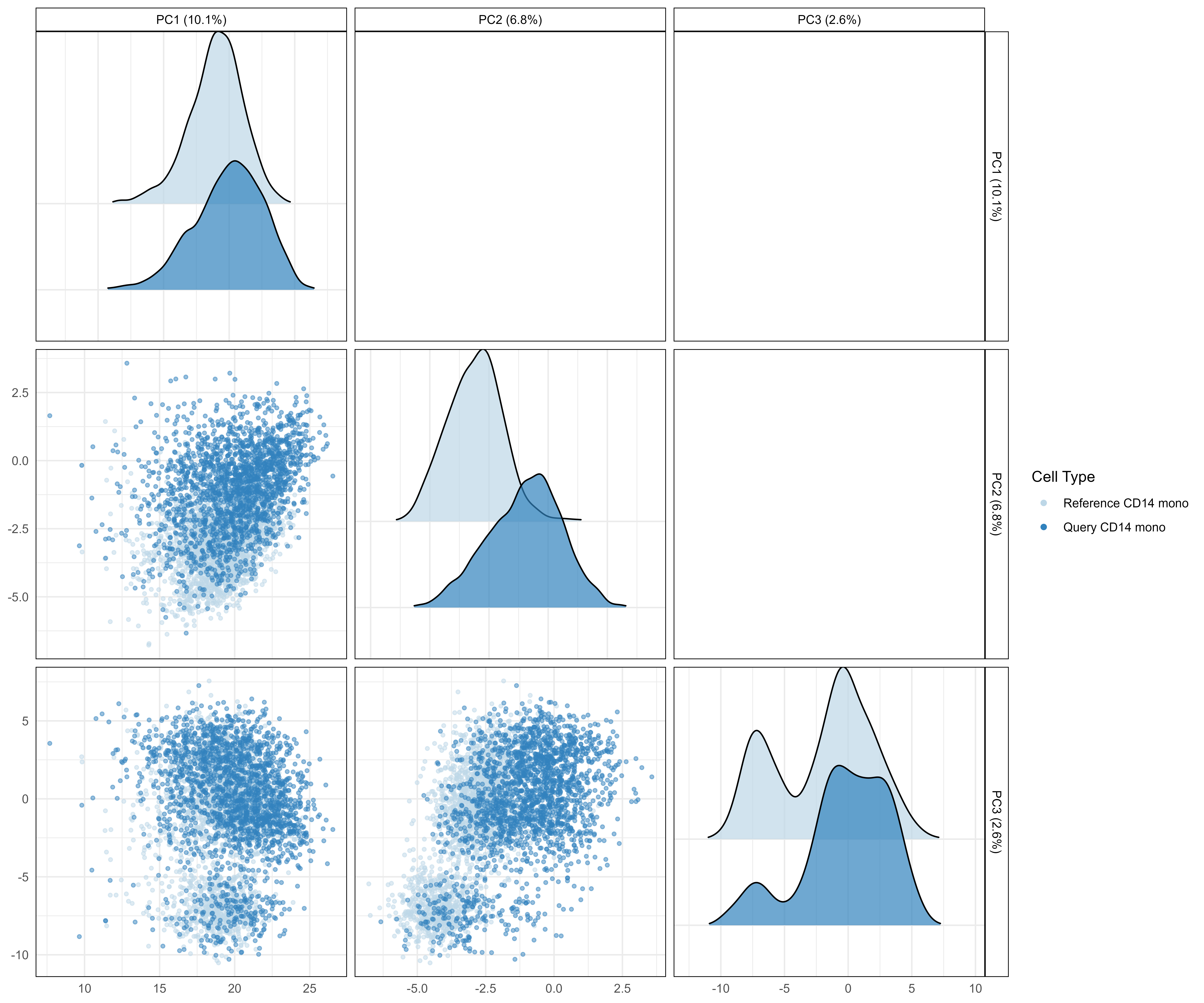 - Diagonal panels: Density distributions of principal components. Reference cells (blue) tightly clustered, query cells (purple) overlapping = good alignment